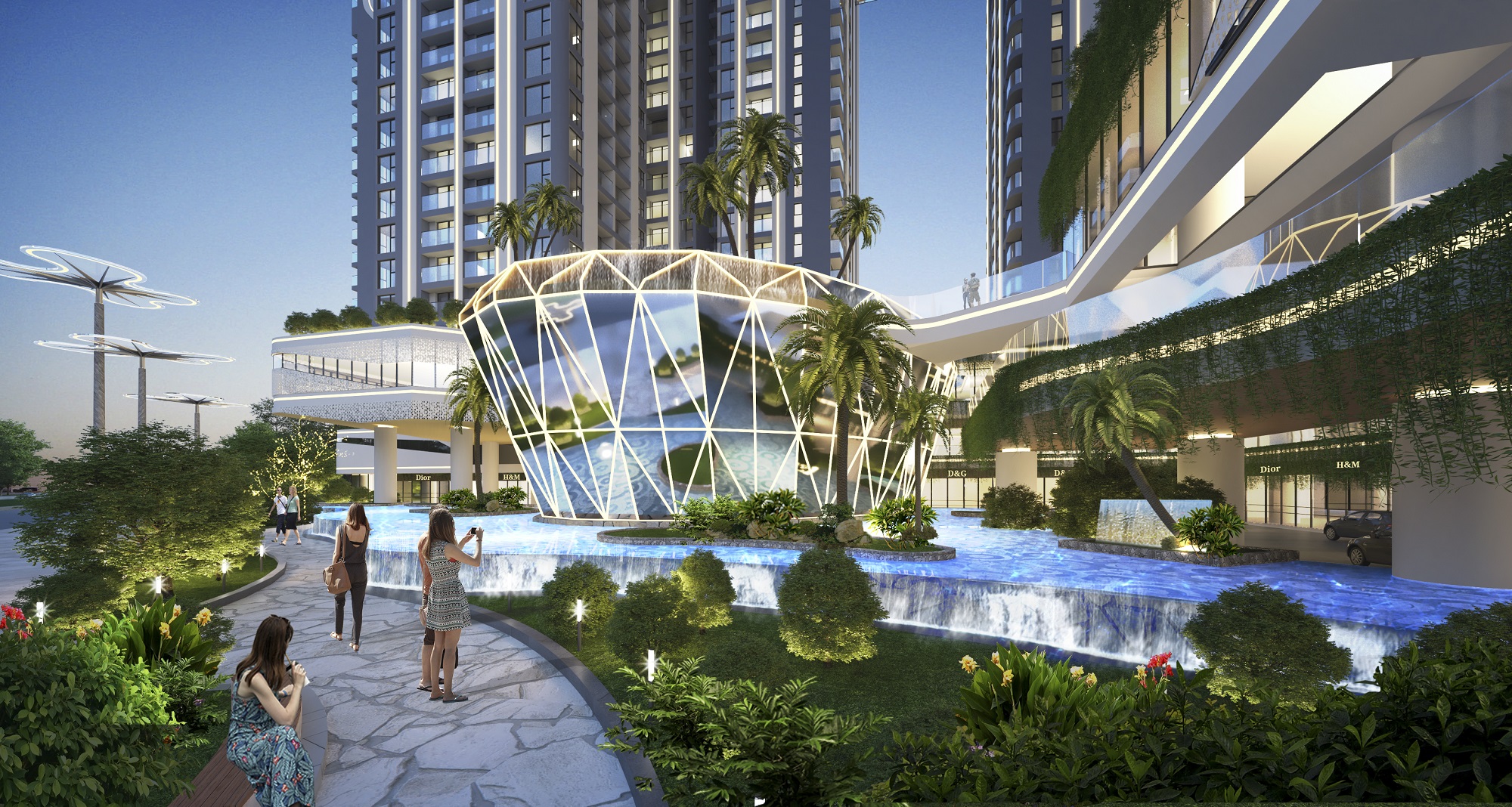 The highlight of the project is the "diamond on water" service space, which is metaphorical as a diamond oasis, with overflowing water space, tropical trees combined with multi -dimensional glass blocks to create a attractive space for the building.